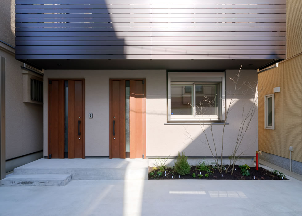 神戸市長田区にH様邸が建築されました。建設地は、東西の隣家が境界近くまで建っておりますので、南面から出来るだけ光が採り入れるように計画されています。ご家族が集うリビング・ダイニングには、大きな窓と吹抜けを設けることで、燦々と光が入り、明るく開放的な快適空間となっております。その分、断熱性能が下がらないように、外張断熱+充填断熱のW断熱に加え、熱の出入りが大きい開口部には、高断熱サッシ+インナーサッシを設置するなどの高断熱仕様。そして気密性能でも、1.0㎠/㎡を切れば高気密といわれるなかで、測定値0.25㎠/㎡という超高気密仕様です。また木の温もりと心地よさを感じられる内装や、オーダーメイドの室内ドアと造り付け家具など、細部までお施主様の拘りを叶えた住宅となっております。
