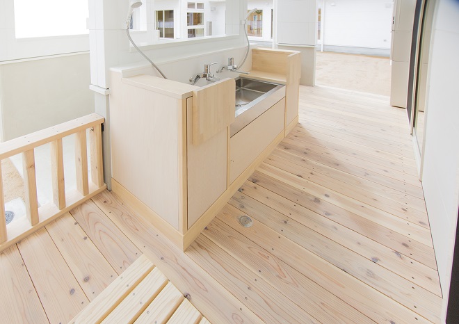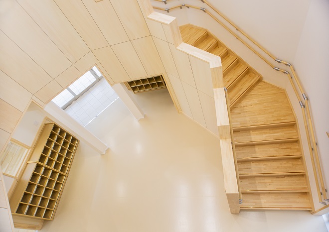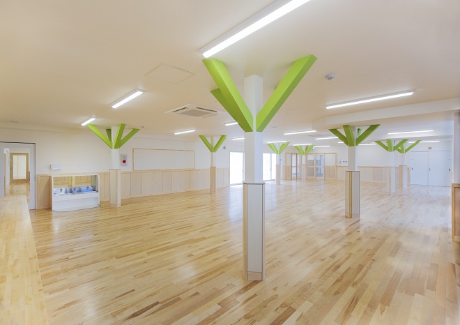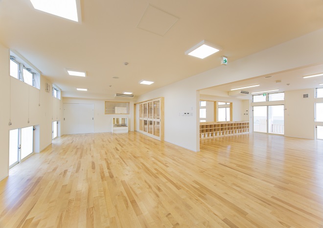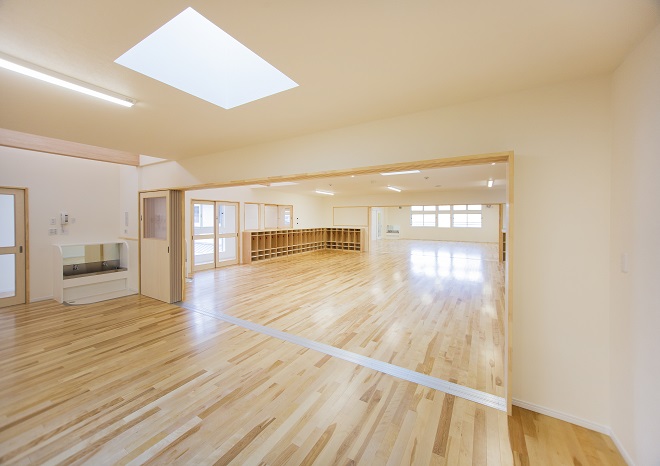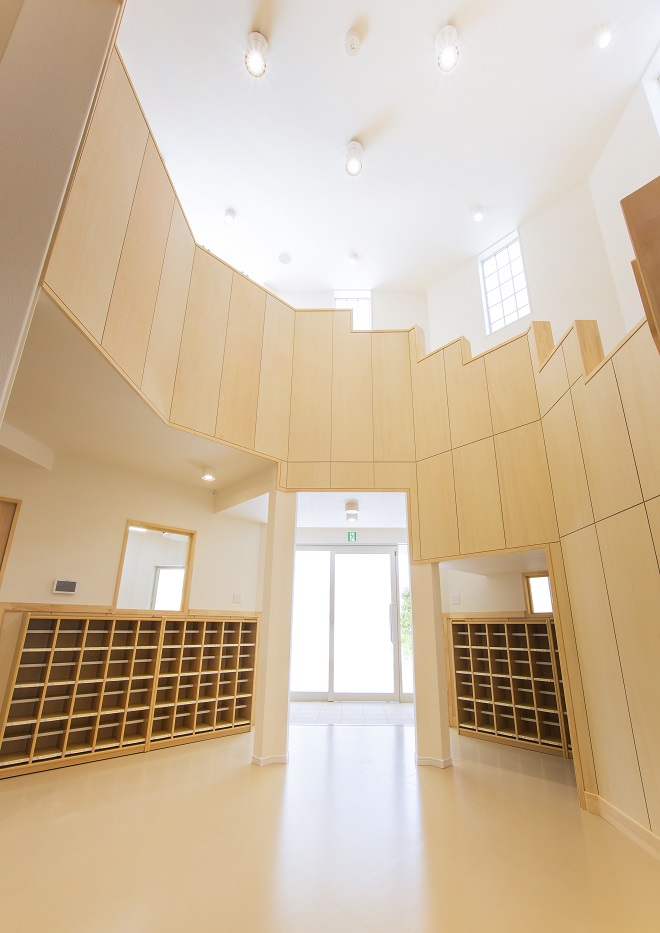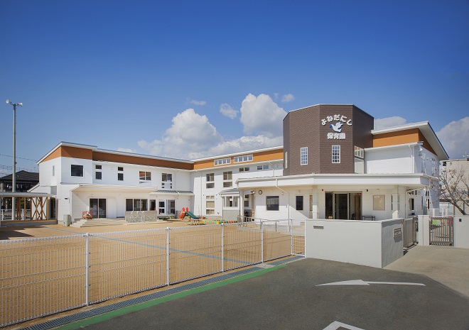 高砂市米田町にて、米田西保育園様の新園舎が完成いたしました。建築計画は、既存の園舎を運営しながら建築を行いまして、完成後、既存園舎を解体撤去し、新たな園庭等を造りました。建物は、延床面積が1243.48㎡もある大型木造建築です。設計の自由度が高く、大空間が取れ、耐震性も高いNK工法にて建築されました。そして温もりがあり、人や環境にやさしい特性を持つ木は、こどもたちに良い影響を与え、快適に過ごすことができます。設計では、毎日の出入りに使われる玄関ホールには、大きな吹き抜けと廻り階段を設け、またランチルームにある柱を木が立っているように演出する等、開放感や楽しさを味わってもらえるように工夫しております。こどもたちの健やかな成長を最優先に取り組んでおられる米田西保育園様の新しい場所が、この度、誕生いたしました。