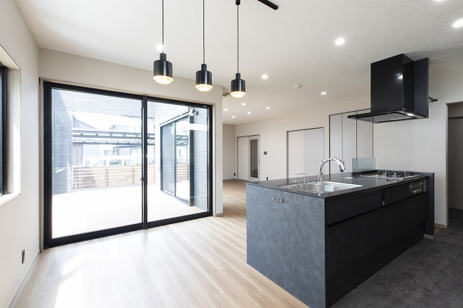 加古川市新神野にT様邸が建築されました。全体的にシャープなイメージで、立体感のある外壁材をメインとしたツートンカラーが印象的な外観です。玄関へのアプローチはスロープを設置して車椅子でも行き来しやすいバリアフリー仕様。家の中心となるLDKでは、システムキッチンを家事動線重視のアイランド型とし、ダイニング・リビングとテラスをつなげることで開放感のある心地よい空間をつくります。また全館空調にて家のなかの寒暖差をなくし、どこにいても快適に過ごせるよう住む人に優しい建物となっております。